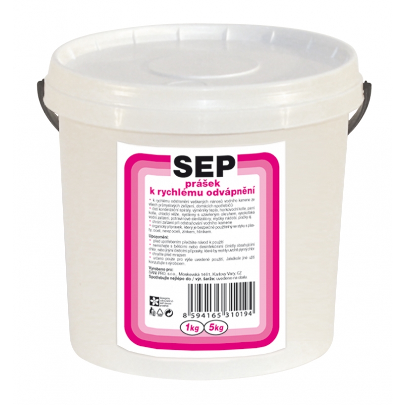 SEP: prášek k rychlému odvápnění a odstranění nánosů vodního kamene z průmyslových zařízení i domácích spotřebičů (kávovary, myčky, žehličky, automatické pračky, ohřívače, apod.) Chrání zařízení při odstraňování vodního kamene. SEP je organický přípravek, který je bezpečně použitelný ve styku s plasty, ocelí, nerez-ocelí, mědí, zinkem a hliníkem.